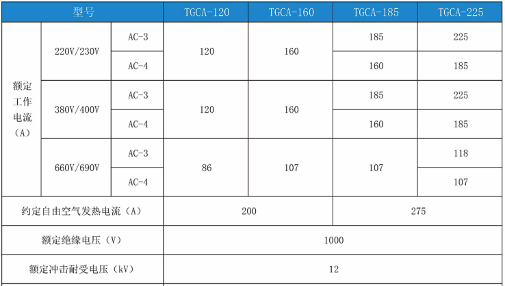 TGCA系列交流接触器(以下简称接触器),主要用于交流50Hz或(50/60Hz),额定工作电压至690V,在AC-3使用类别下额定工作电压380V时,额定工作电流至630A的电力系统中供远距离接通和分断电路之用。并可与适当的热过载继电器组成电磁起动器,以保护可能发生过负荷的电路。接触器适宜于频繁的起动和控制交流电动机。